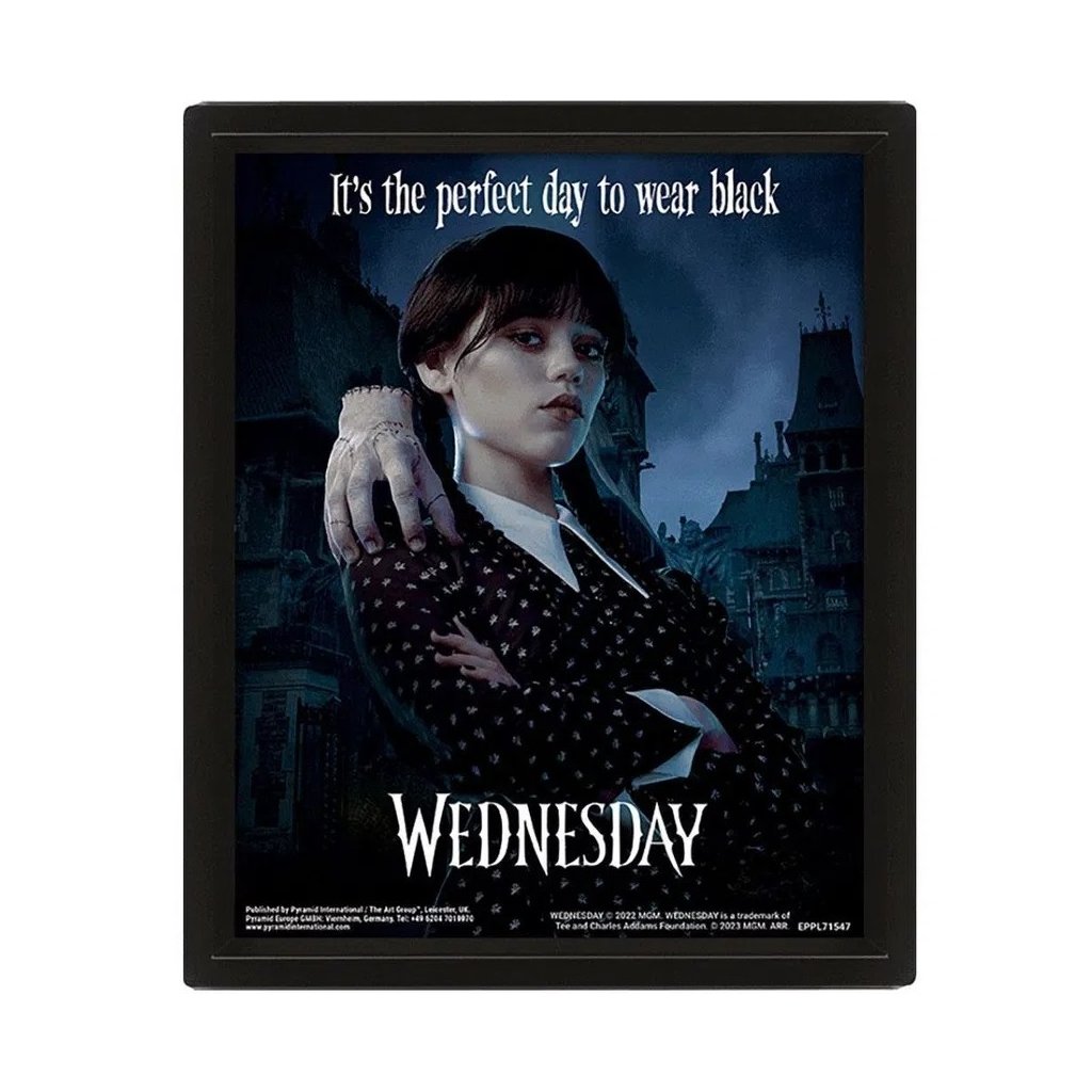 Tento originální 3D obraz je ten pravý dárek pro fanoušky Wednesday Zarámovaný 3D obraz s Wednesday Addamsovou, hlavní hrdinkou stejnojmenného seriálu a s věrným druhem jménem Věc na rameni. Obraz budí zdání pohybu a Wednesday vás bude neustále sledovat pohledem. Rozměr: 36 x 20 cmDoplňkové parametry