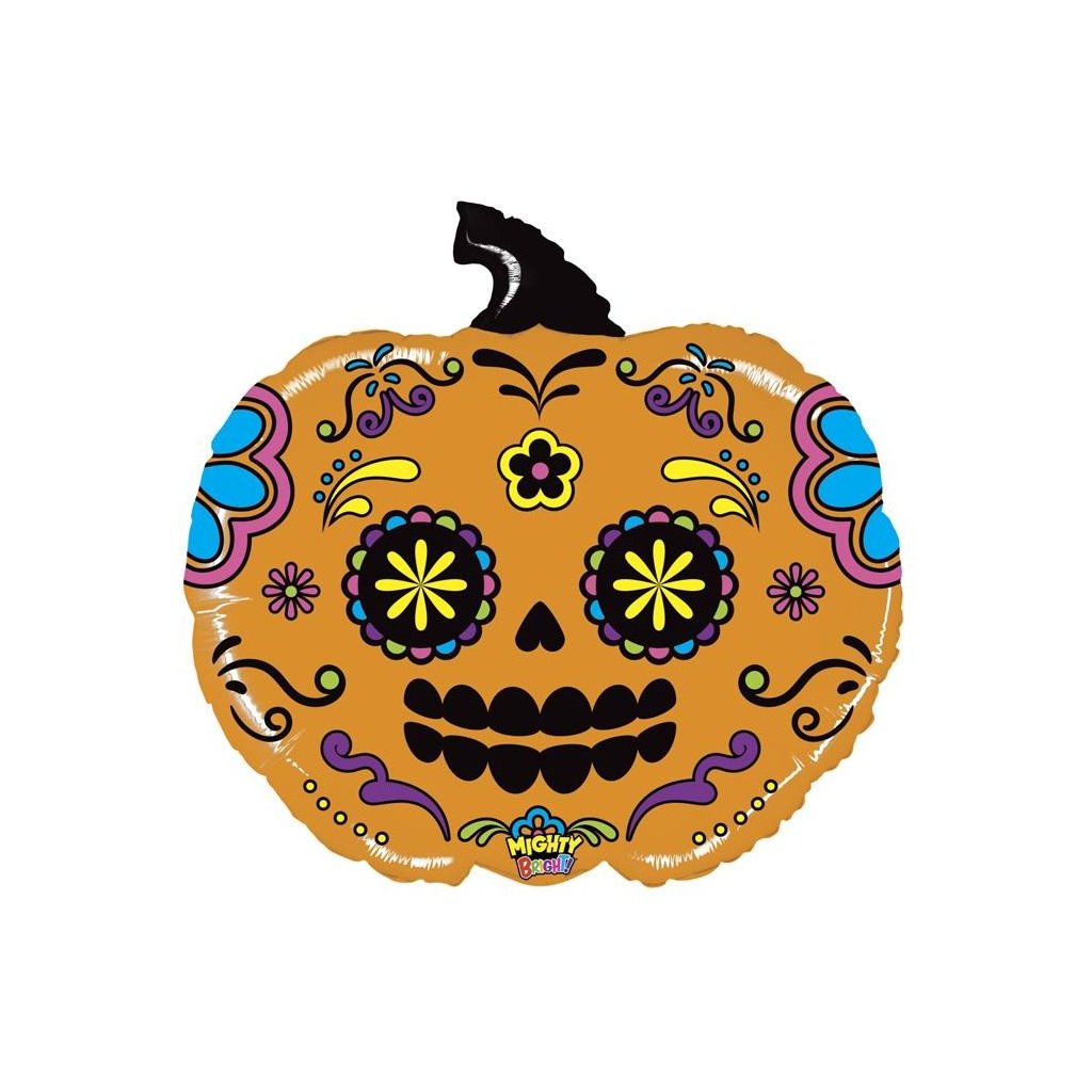 Balónek fóliový Dýně sugar skull znázorňuje velké s obrázky různých postav, včetně oranžové dýně pomalované mexickou smrtí, které se s tímto svátkem spojují. Ideální doplněk na výzdobu interiéru domu nebo vchodu, či venkovních dveří. Velikost 71cm Lze nafukovat vzduchemi héliemDoplňkové parametry