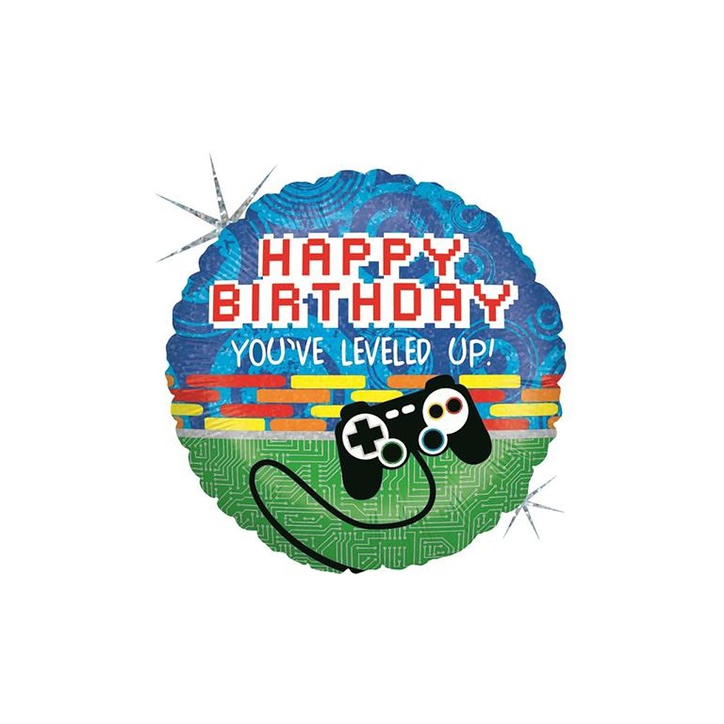 Fóliový balónek s herním ovladačem, nápisem Happy Birthday a nápisem You've leveled up! potěší každého hráče a je ideální doplněk výzdoby na narozeninovou oslavu s herní tematikou. Balónek je vyrobený z recyklovaného materiálu, s možností nafouknutí heliem. Velikost 46 cmDoplňkové parametry