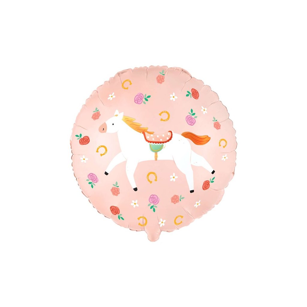 Popřejte oslavenci tímto krásným balónkem s koníčkem. Fóliový balónek kulatého tvaru s obrázkem koníka na růžovém pozadí s barevnými květinami a zlatými podkovami. Tento balónek je ideální jako dárek, ale především vám stylově ozdobí tématickou párty s Koníky. Velikost 35 cm Lze nafukovat vzduchem i héliem a opakovaně dofukovat přes brčko.Doplňkové parametry