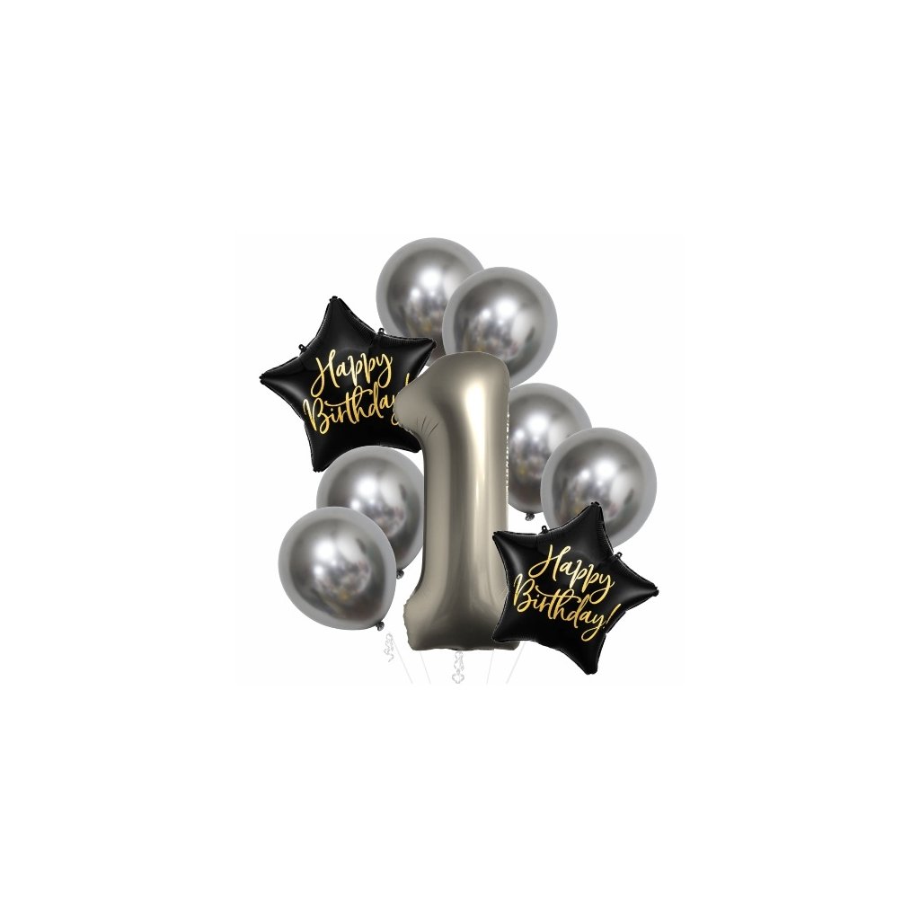 Balónkový buket s chromovými balónky na výzdobu 1.narozenin a s nápisy Happy Birthday stříbrný Set obsahuje: 1 x fóliový balónek číslo 1 stříbrné barvy výšky 86 cm 2 x fóliový balónek černé barvy ve tvaru hvězdy se zlatým nápisem Happy Birthday 6 x latexový balónek 30 cm chromový stříbrný Tato narozeninová balónková kytice v luxusním chromovém provedení je tím pravým překvapením pro oslavence i jeho hosty. Kombinace chromových balónků je vhodná jako dekorace na oslavu i jako dárek pro oslavence. Lze plnit vzduchem i héliemDoplňkové parametry