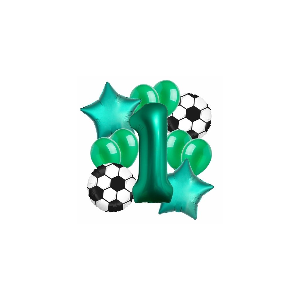 Narozeninový balónkový buket s fotbalovým tématem s číslem 1 Tato narozeninová balónková kytice v luxusním chromovém provedení je tím pravým překvapením pro malého i velkého fanouška fotbalu. Kombinace chromových balonů je vhodná jako dekorace na oslavu i jako dárek pro oslavence. Set obsahuje:1x velký balónek chromový v zelené barvě číslo 1 (86 cm), 2x fóliový balónek hvězda, 2x fóliový balónek míč, 6x latexový balónek.Doplňkové parametry