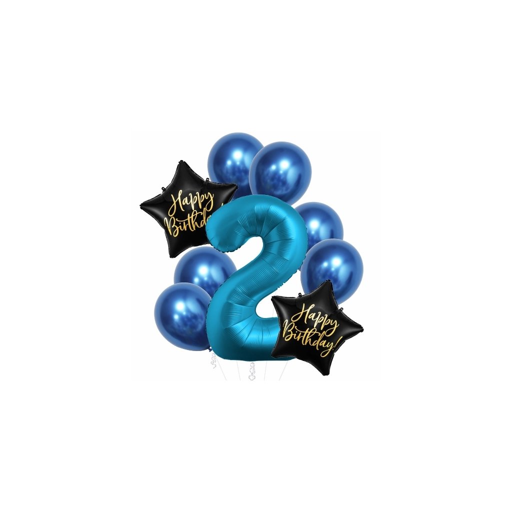 Balónkový buket s chromovými balónky na výzdobu 2.narozenin a s nápisy Happy Birthday modrý Set obsahuje: 1 x fóliový balónek číslo 2 modré barvy výšky 86 cm 2 x fóliový balónek černé barvy ve tvaru hvězdy se zlatým nápisem Happy Birthday 6 x latexový balónek 30 cm chromový modrý Tato narozeninová balónková kytice v luxusním chromovém provedení je tím pravým překvapením pro oslavence i jeho hosty. Kombinace chromových balónků je vhodná jako dekorace na oslavu i jako dárek pro oslavence. Lze plnit vzduchem i héliemDoplňkové parametry