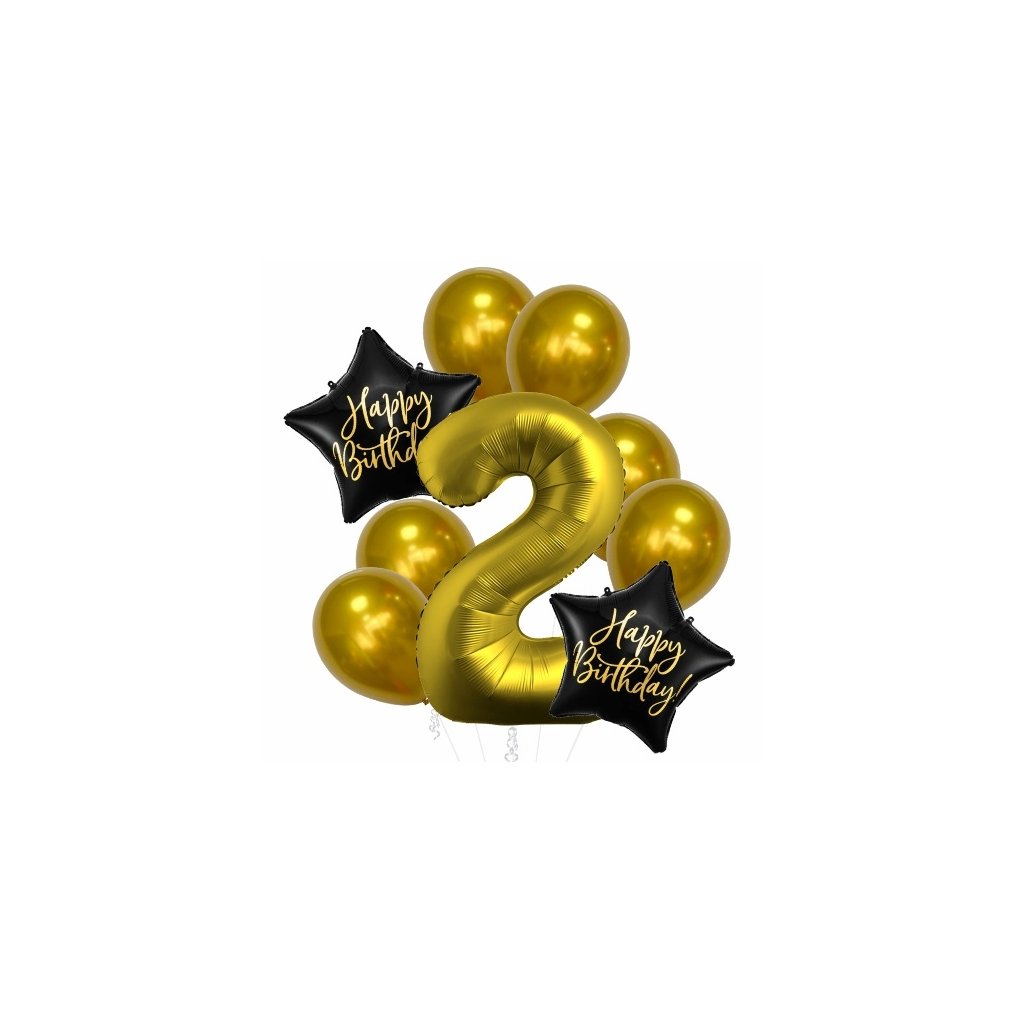 Balónkový buket s chromovými balónky na výzdobu 2.narozenin a s nápisy Happy Birthday zlatý Set obsahuje: 1 x fóliový balónek číslo 2 zlaté barvy výšky 86 cm 2 x fóliový balónek černé barvy ve tvaru hvězdy se zlatým nápisem Happy Birthday 6 x latexový balónek 30 cm chromový zlatý Tato narozeninová balónková kytice v luxusním chromovém provedení je tím pravým překvapením pro oslavence i jeho hosty. Kombinace chromových balónků je vhodná jako dekorace na oslavu i jako dárek pro oslavence. Lze plnit vzduchem i héliemDoplňkové parametry