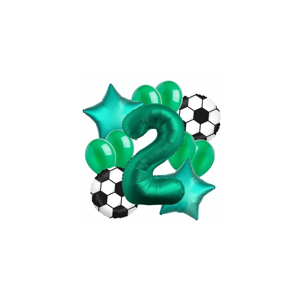 Narozeninový balónkový buket s fotbalovým tématem s číslem 2 Tato narozeninová balónková kytice v luxusním chromovém provedení je tím pravým překvapením pro malého i velkého fanouška fotbalu. Kombinace chromových balonů je vhodná jako dekorace na oslavu i jako dárek pro oslavence. Set obsahuje:1x velký balónek chromový v zelené barvě číslo 2 (86 cm), 2x fóliový balónek hvězda, 2x fóliový balónek míč, 6x latexový balónek.Doplňkové parametry