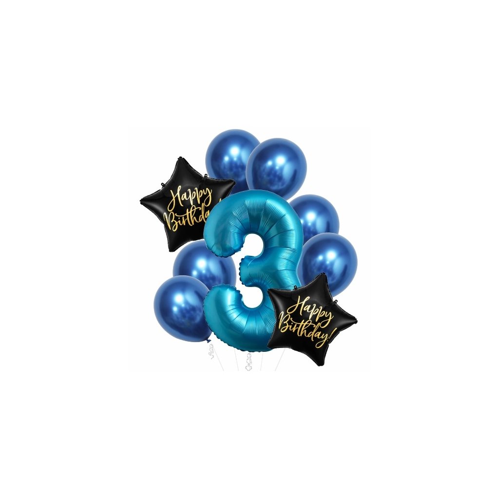 Balónkový buket s chromovými balónky na výzdobu 3.narozenin a s nápisy Happy Birthday modrý Set obsahuje: 1 x fóliový balónek číslo 3 modré barvy výšky 86 cm 2 x fóliový balónek černé barvy ve tvaru hvězdy se zlatým nápisem Happy Birthday 6 x latexový balónek 30 cm chromový modrý Tato narozeninová balónková kytice v luxusním chromovém provedení je tím pravým překvapením pro oslavence i jeho hosty. Kombinace chromových balónků je vhodná jako dekorace na oslavu i jako dárek pro oslavence. Lze plnit vzduchem i héliemDoplňkové parametry