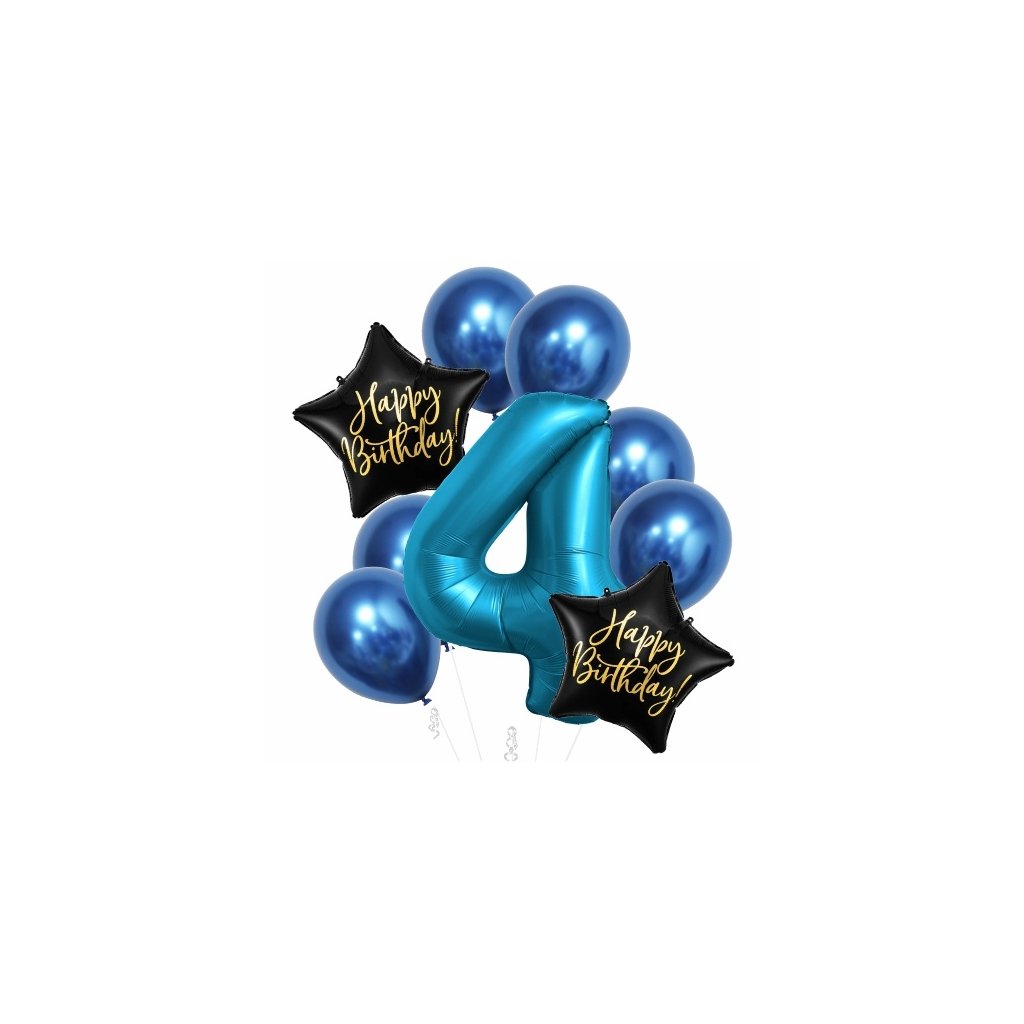 Balónkový buket s chromovými balónky na výzdobu 4.narozenin a s nápisy Happy Birthday modrý Set obsahuje: 1 x fóliový balónek číslo 4 modré barvy výšky 86 cm 2 x fóliový balónek černé barvy ve tvaru hvězdy se zlatým nápisem Happy Birthday 6 x latexový balónek 30 cm chromový modrý Tato narozeninová balónková kytice v luxusním chromovém provedení je tím pravým překvapením pro oslavence i jeho hosty. Kombinace chromových balónků je vhodná jako dekorace na oslavu i jako dárek pro oslavence. Lze plnit vzduchem i héliemDoplňkové parametry