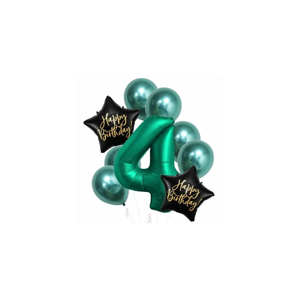 Balónkový buket s chromovými balónky na výzdobu 4.narozenin a s nápisy Happy Birthday zelený Set obsahuje: 1 x fóliový balónek číslo 4 zelené barvy výšky 86 cm 2 x fóliový balónek černé barvy ve tvaru hvězdy se zlatým nápisem Happy Birthday 6 x latexový balónek 30 cm chromový zelený Tato narozeninová balónková kytice v luxusním chromovém provedení je tím pravým překvapením pro oslavence i jeho hosty. Kombinace chromových balónků je vhodná jako dekorace na oslavu i jako dárek pro oslavence. Lze plnit vzduchem i héliemDoplňkové parametry