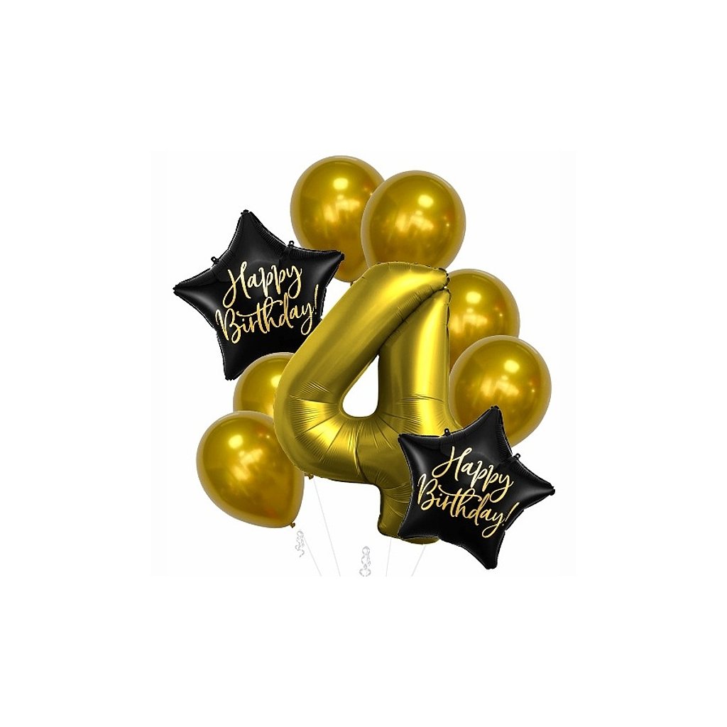 Balónkový buket s chromovými balónky na výzdobu 4.narozenin a s nápisy Happy Birthday zlatý Set obsahuje: 1 x fóliový balónek číslo 4 zlaté barvy výšky 86 cm 2 x fóliový balónek černé barvy ve tvaru hvězdy se zlatým nápisem Happy Birthday 6 x latexový balónek 30 cm chromový zlatý Tato narozeninová balónková kytice v luxusním chromovém provedení je tím pravým překvapením pro oslavence i jeho hosty. Kombinace chromových balónků je vhodná jako dekorace na oslavu i jako dárek pro oslavence. Potěší malé i velké oslavence. Lze plnit vzduchem i héliemDoplňkové parametry