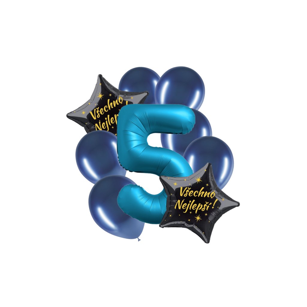 Balónkový buket s chromovými balónky na výzdobu 5.narozenin a s nápisy Happy Birthday modrý Set obsahuje: 1 x fóliový balónek číslo 5 modré barvy výšky 86 cm 2 x fóliový balónek černé barvy ve tvaru hvězdy se zlatým nápisem Happy Birthday 6 x latexový balónek 30 cm chromový modrý Tato narozeninová balónková kytice v luxusním chromovém provedení je tím pravým překvapením pro oslavence i jeho hosty. Kombinace chromových balónků je vhodná jako dekorace na oslavu i jako dárek pro oslavence. Lze plnit vzduchem i héliemDoplňkové parametry