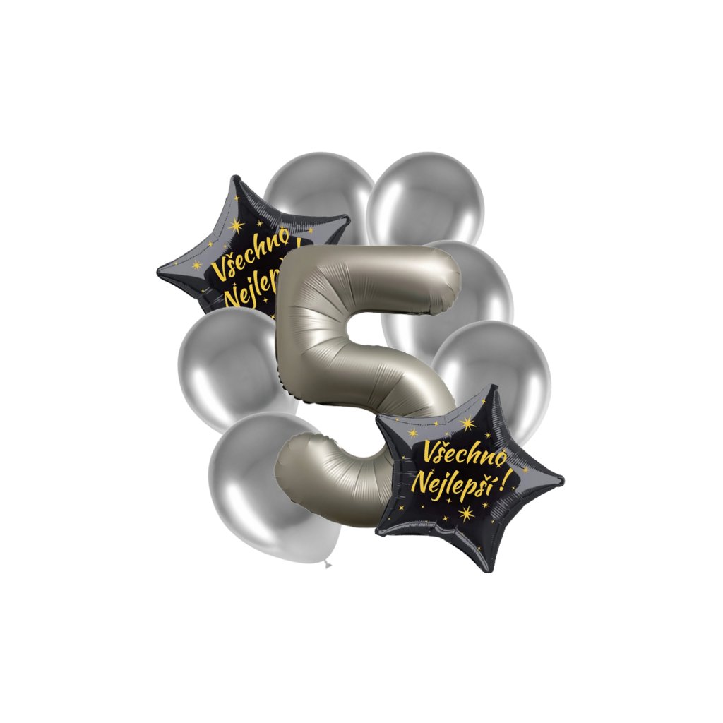 Balónkový buket s chromovými balónky na výzdobu 5.narozenin a s nápisy Happy Birthday stříbrný Set obsahuje: 1 x fóliový balónek číslo 5 stříbrné barvy výšky 86 cm 2 x fóliový balónek černé barvy ve tvaru hvězdy se zlatým nápisem Happy Birthday 6 x latexový balónek 30 cm chromový stříbrný Tato narozeninová balónková kytice v luxusním chromovém provedení je tím pravým překvapením pro oslavence i jeho hosty. Kombinace chromových balónků je vhodná jako dekorace na oslavu i jako dárek pro oslavence. Lze plnit vzduchem i héliemDoplňkové parametry