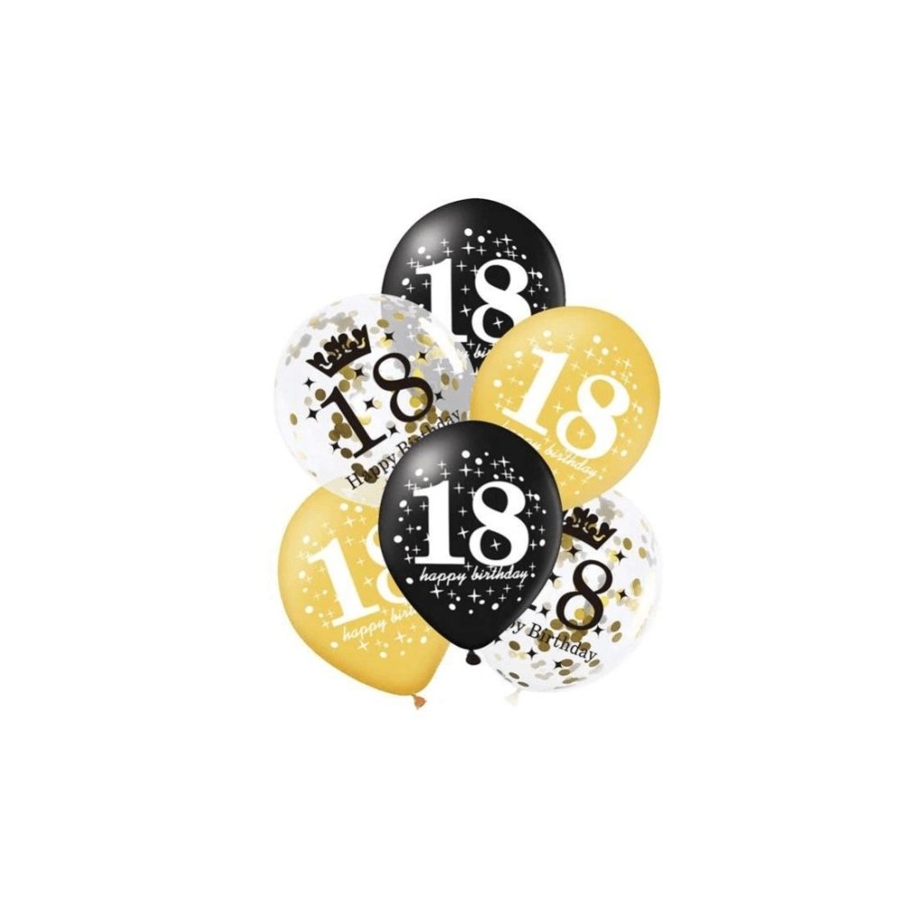 Sada latexových balónků k výzdobě oslavy 18. narozenin Sada se skládá ze šesti balónků s natištěným číslem 18 - černého, zlatého a průhledného s konfetami. Nechybí ani 10 m pásky k jejich svázání. Velikost: 30 cm Balení obsahuje 6 ks Balónky lze nafukovat vzduchem i héliemDoplňkové parametry