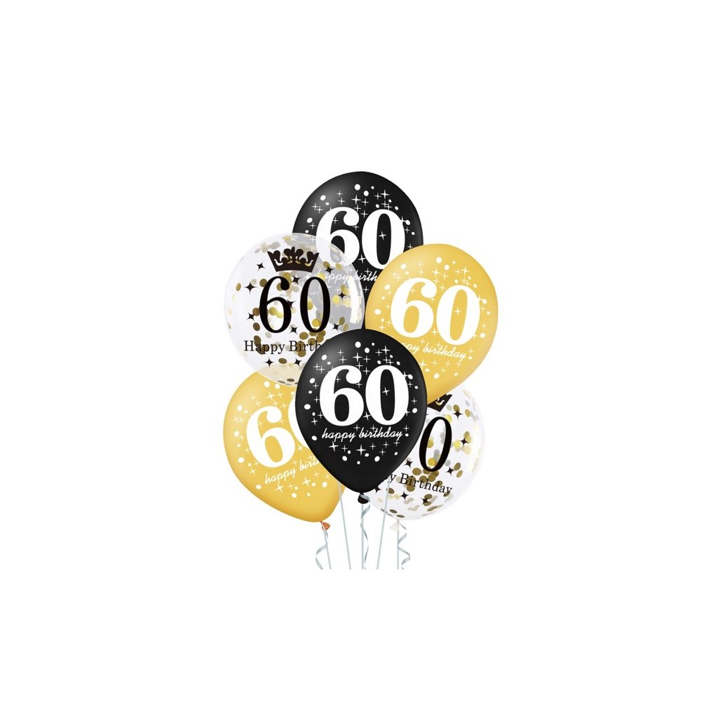 Sada latexových balónků k výzdobě oslavy 60. narozenin Sada se skládá ze šesti balónků s natištěným číslem 60 - černého, zlatého a průhledného s konfetami. Nechybí ani 10 m pásky k jejich svázání. Velikost: 30 cm Balení obsahuje 6 ks Balónky lze nafukovat vzduchem i héliemDoplňkové parametry