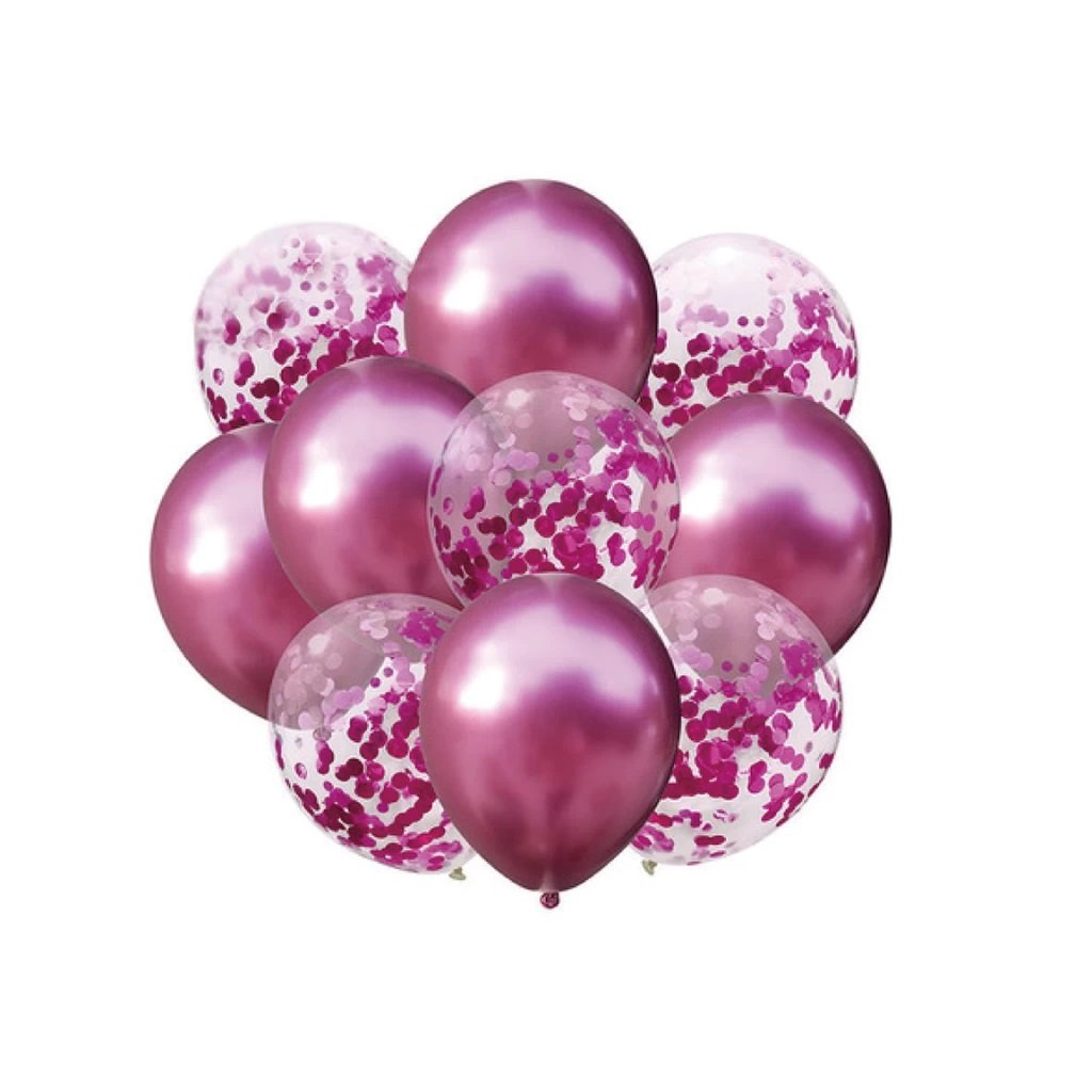 Latexové chromové a transparentní balónky s konfetami v tmavě růžové barvě se budou hodit pro výzdobu na svatbu, narozeniny a jiné další další události. Balení obsahuje 10 ks balónků :5x balónky průhledné s konfetami v sytě růžové barvě a 5x jednobarevné chromové tmavě růžové. Nechybí v balení ani 10 m páska na uvázání. Velikost: 30 cm Balónky lze nafukovat vzduchem i héliemDoplňkové parametry