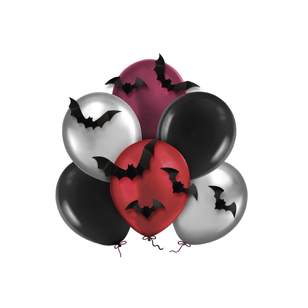 Halloweenské latexové metalické balónky, zdobené černými netopýry. Tyto balónky nesmí chybět na čarodějniícké nebo halloweenské párty jak pro děti, tai i pro dospělé. Sada obsahuje 6 ks balónků: 2 stříbrné chromové, 2 černé, 1 dvojitý vínový, 1 dvojitý vínový Balónky lze plnit vzduchem i héliemDoplňkové parametry