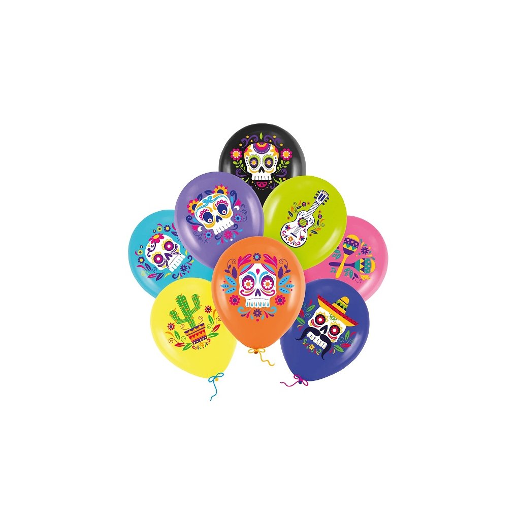 Latexové balónky s mexickými halloweenskými vzory Balení obsahuje 8 js balónků v mixu barev (žlutý, zelený, oranžový, růžový, fialový, modrý, tmavě modrý, černý). Velikost 30 cm Balónky lze nafukovat vzduchem i héliemDoplňkové parametry
