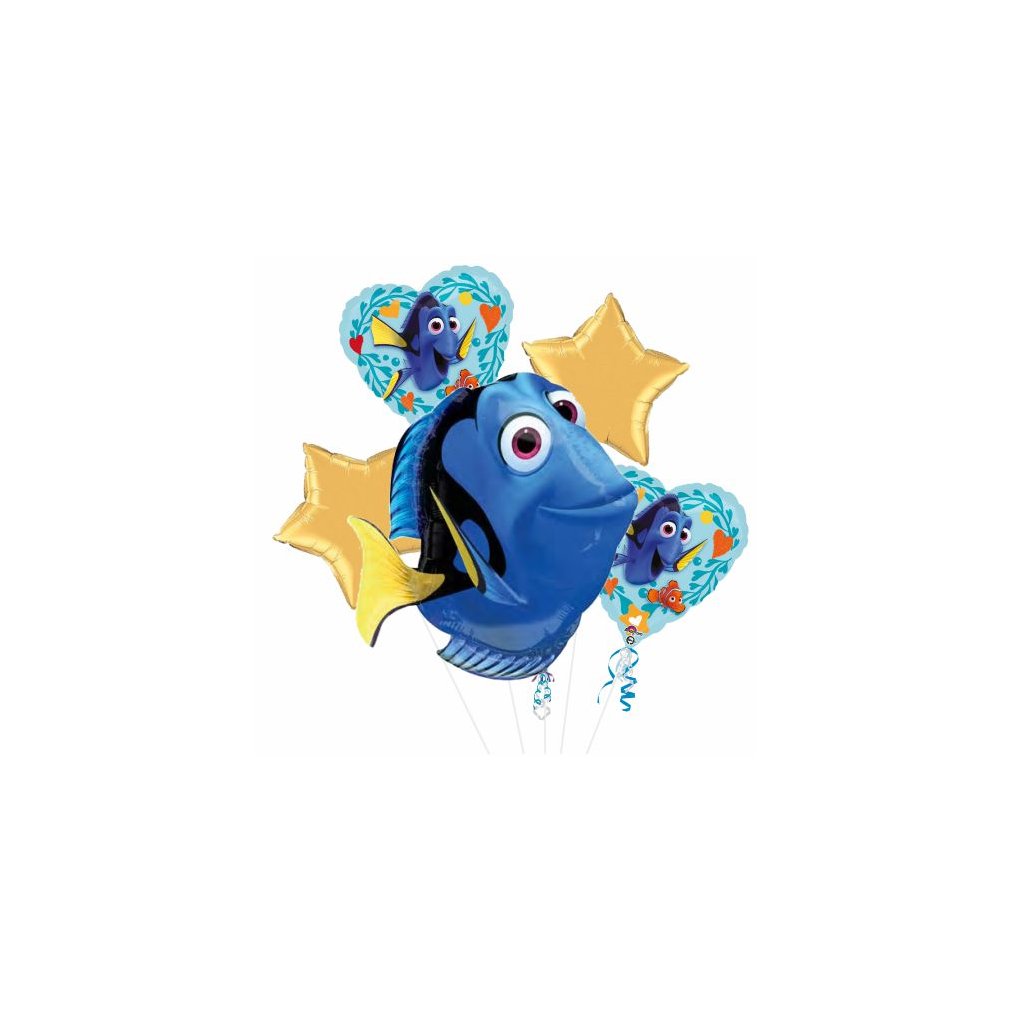 Balónková kytice Hledá se Dory Balónkový buket se skládá z 5 fóliových balónků na dětskou narozeninovou párty - oslavu. Set obsahuje 1 x fóliový balónek Dory, 2 x 45 cm fóliový balóneks Dory ve tvaru srdíčka, 2 x 45 cm , 2 x fóliový balónek zlatá hvězda. Balónky lze plnit vzduchem i héliemDoplňkové parametry