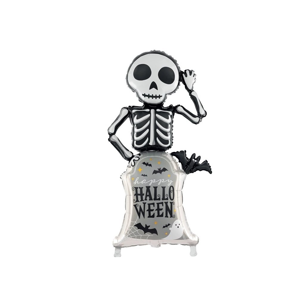 Fóliový balónedk Kostra na náhrobku Halloween je perfektní dekorací pro vaši halloweenskou párty. T ento opravdu velký balónek má design kostry stojící na náhrobku, což dodá vaší výzdobě autentický a strašidelný nádech. S jeho rozměry 58 x120,5 cm je dostatečně velký na to, aby zaujal pozornost a vytvořil nezapomenutelnou atmosféru. Je vyrobený z kvalitního fóliového materiálu, který zaručuje jeho trvanlivost a odolnost. Pokud chcete, aby balónek létal, můžete jej naplnit heliem.Doplňkové parametry