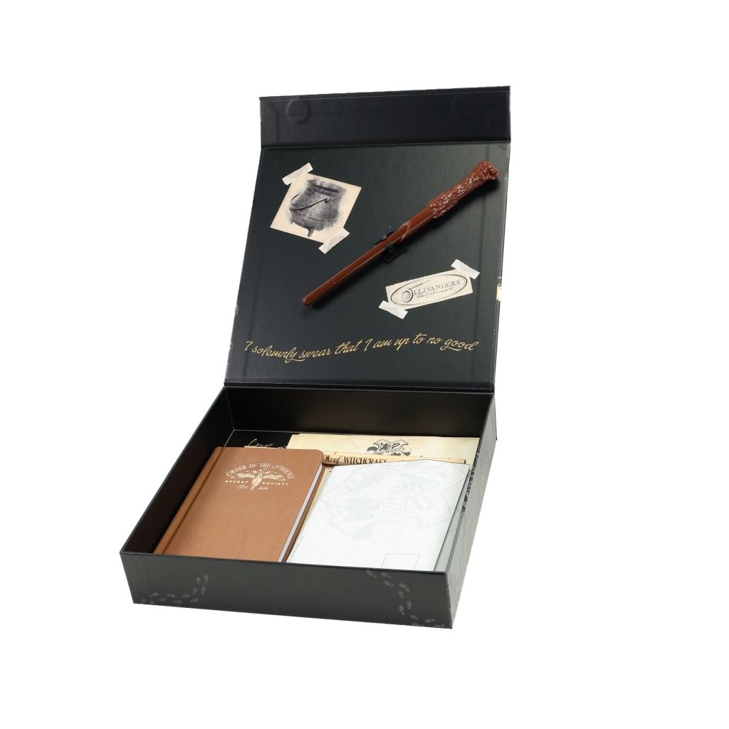 Originální dárková sada Harry Potter v pevném boxu. Tento krásně navržený dárkový box obsahuje vše, co potřebujete k odesílání magických dopisů. Balení obsahuje 1x zápisník o velikosti A5, psací pero/hůlku, 2× tužku, pravítko, ořezávátko, gumu, 6 obálek, 12 dopisních papírů, 5x arch samolepek a 10x pečetní samolepky na dopis. Ideální dárek pro fandy kouzelnického světa Harryho Pottera.Doplňkové parametry