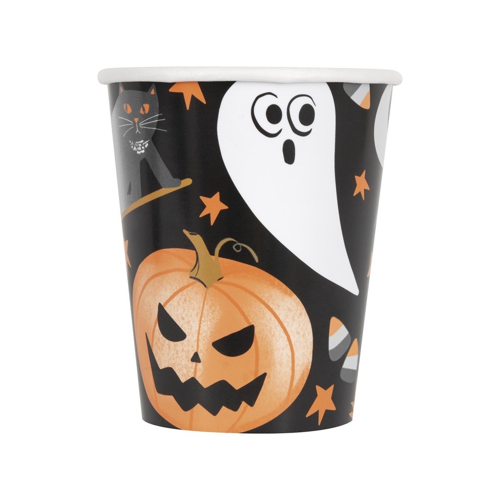 Papírové jednorázové kelímky Halloween Talířky mají potisk s černou kočkou, duchem a dýně Ideální doplněk stolování na dětskou strašidelnou párty. Objem 250 ml Balení obsahuje 8 ksDoplňkové parametry