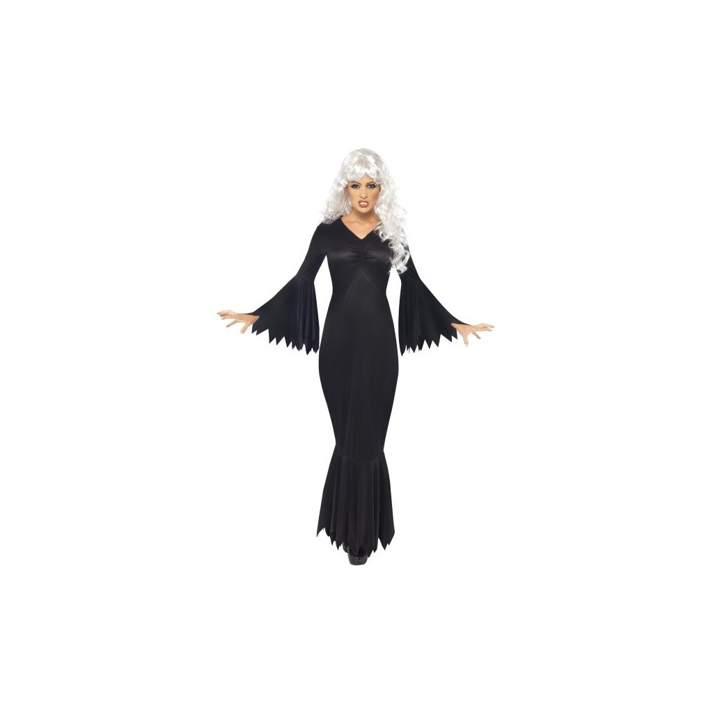 Dámský dlouhý černý kostým půlnočního upírky je elegantní a všestranný, ideální pro čarodějnickou, gotickou nebo halloweenskou párty. Dlouhé černé šaty mají výstřih do V a zubatě střižené rukávy a lem. Velikost L Paruka není součástí kostýmuDoplňkové parametry