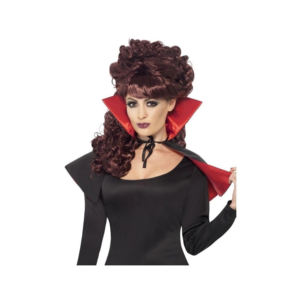 Elegantní mini upírský plášť s vysokým límcem a zavazováním pod krkem. Tento doplněk je ideální pro upírské kostýmy na halloweenskou párty. Je černý z vnější strany a červený z vnitřní. Plášť zakrývá pouze ramena a má také vysoký límec.Doplňkové parametry