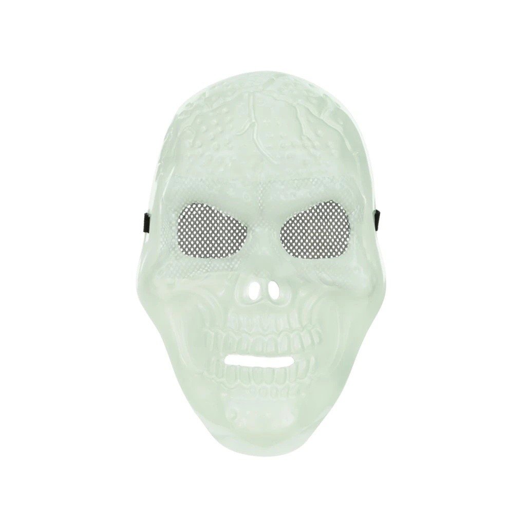 Originální plastová maska na obličej Lebka Tato detailně zpracovaná maska lebky ve světlounce zelenkavé barvě je navržena tak, aby po nasvícení zářila ve tmě. Jemná síťka na očích zajišťuje částečné zakrytí bez omezení výhledu a působí ještě víc děsivě. Maska, svítící ve tmě je opatřená elastickým páskem Velikost 17 x 27 cm.Doplňkové parametry