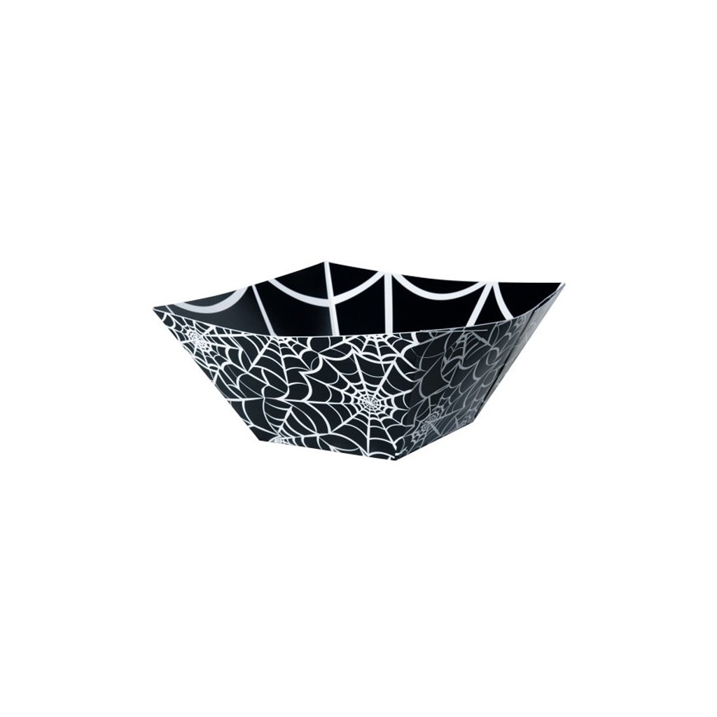 Papírová čtvercová miska s motivem pavučiny. Papírová miska na občerstvení na halloweenské nebo čarodějnické párty má rozměry 28 x 28 x 11,5 cm. Jednorázová papírová miska umožňuje rychlý úklid. Je vyrobená z kvalitního a netoxického papírového materiálu, který je pevný a bezpečný pro potraviny.Doplňkové parametry