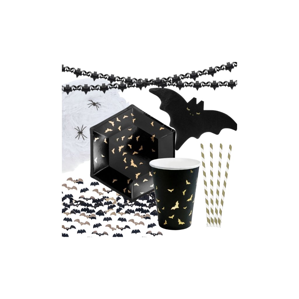 Tematická sada dekorací a stolování pro děsivě zábavnou Halloween párty. Ideální pro dětskou oslavu i večírek pro dospělé v černooranžové atmosféře. Obsah balení: 1× Girlanda Netopýr – papírová, černá, délka 4 m 1× Konfety Netopýři – 15 g 1× Papírové kelímky Trick or Treat – 220 ml, 6 ks 1× Pavučina Halloween – bílá, 60 g 1× Ubrousky Netopýr – 20 ks 1× Papírová brčka – zlaté proužky, 10 ks 1× Papírové talíře Trick or Treat – 20 cm, 6 ks Snadné a rychlé řešení pro vytvoření strašidelné atmosféry. Vše, co potřebujete pro Halloween oslavu v jednom balení.Doplňkové parametry