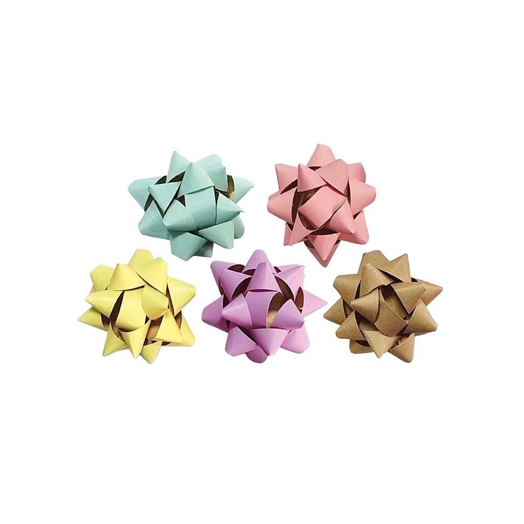Rozetka z kraftového papíru v pastelových barvách. Tato moderní ozdoba dodá vašim dárkům šmrnc a eleganci. Díky praktické lepící pásce na spodní straně ji snadno připevníte na jakoukoli dárkovou krabičku. Bezva pomocník pro každou příležitost, kdy chcete udělat radost a zanechat nezapomenutelný dojem. Mix barev Průměr: 7 cm Šířka stuhy: 1,5 cm Barva: žlutá, zelená, fialová, růžová, hnědá Cena za 1 kusDoplňkové parametry