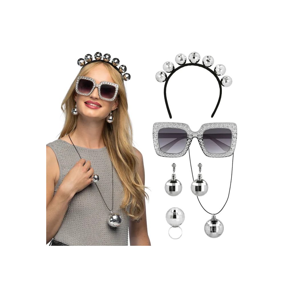 Kompletní disco set je perfektním pro disco nebo retro párty 70. a 80. let. S touto sadou vytvoříte mrknutím oka velkolepý styl, inspirovaný bláznivými disco tanečními parkety. Sada obsahuje: Čelenku, která je zdobená stříbrnými disko koulemi, které přitahují pozornost a dodávají lesk Brýle jsou velké čtvercové obroučky s lesklými dekoracemi Náhrdelník je s přívěskem ve tvaru disco koule Prsten je také s disco koulí Náušnice jsou závěsné, s charakteristickými kuličkami ,imitujícími miniaturní disco koule.Doplňkové parametry