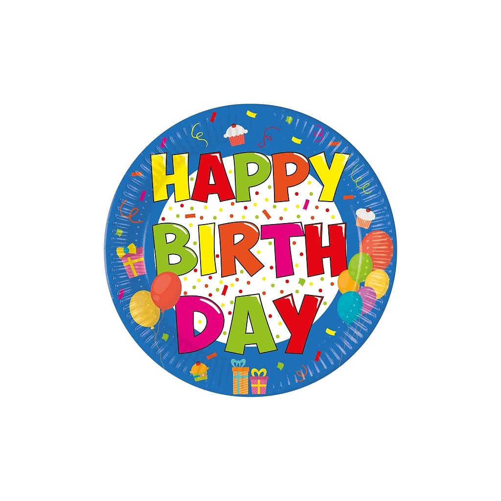 Originální papírové talíře na narozeninovou párty. Tyto veselé talíře s nápisem Happy Birthday jsou vhodné pro každou narozeninovou oslavu. Svou barevností zaujmou a dodají vašemu stolování krásný barevný tón. Vhodné na menší pohoštění, jako jsou chlebíčky, dort, cupcakkes, muffiny a další dobroty. Velikost : 23 cm Balení obsahuje 8 ks Talíře jsou šetrné k životnímu prostředí. Jsou vyrobeny z ekologicky šetrného materiálu.Doplňkové parametry