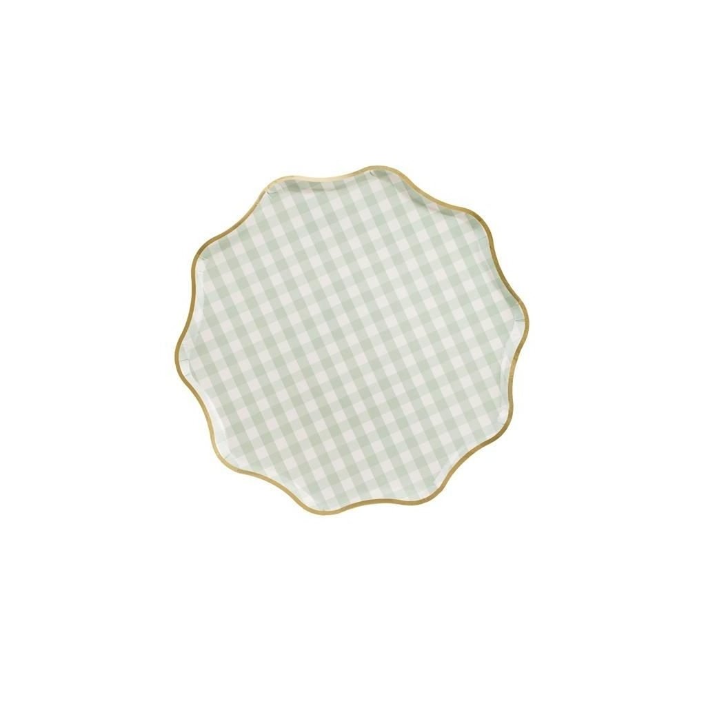 Papírové talířky v něžném designu vynikají kostkovaným vzorem v pastelově zelené barvě a lesklým zlatým lemem, který jim dodává elegantní nádech. Díky pevnému papíru jsou praktické a zároveň krásně ladí s dalšími doplňky z kolekce – ideální volba na baby shower, oslavu narození miminka, piknik, letní párty nebo stylové čajové posezení. Díky svému tvaru s jemně zvlněným okrajem působí jemně a slavnostně. Skvěle ladí s motivem vintage kočárku, květinovým potiskem a pastelovými tóny – doporučujeme kombinovat se stejnou kolekcí kelímků a ubrousků. Průměr: 23 cm Barva: zelenobílý kostkovaný vzor, zlatý lem Balení: 6 ksDoplňkové parametry