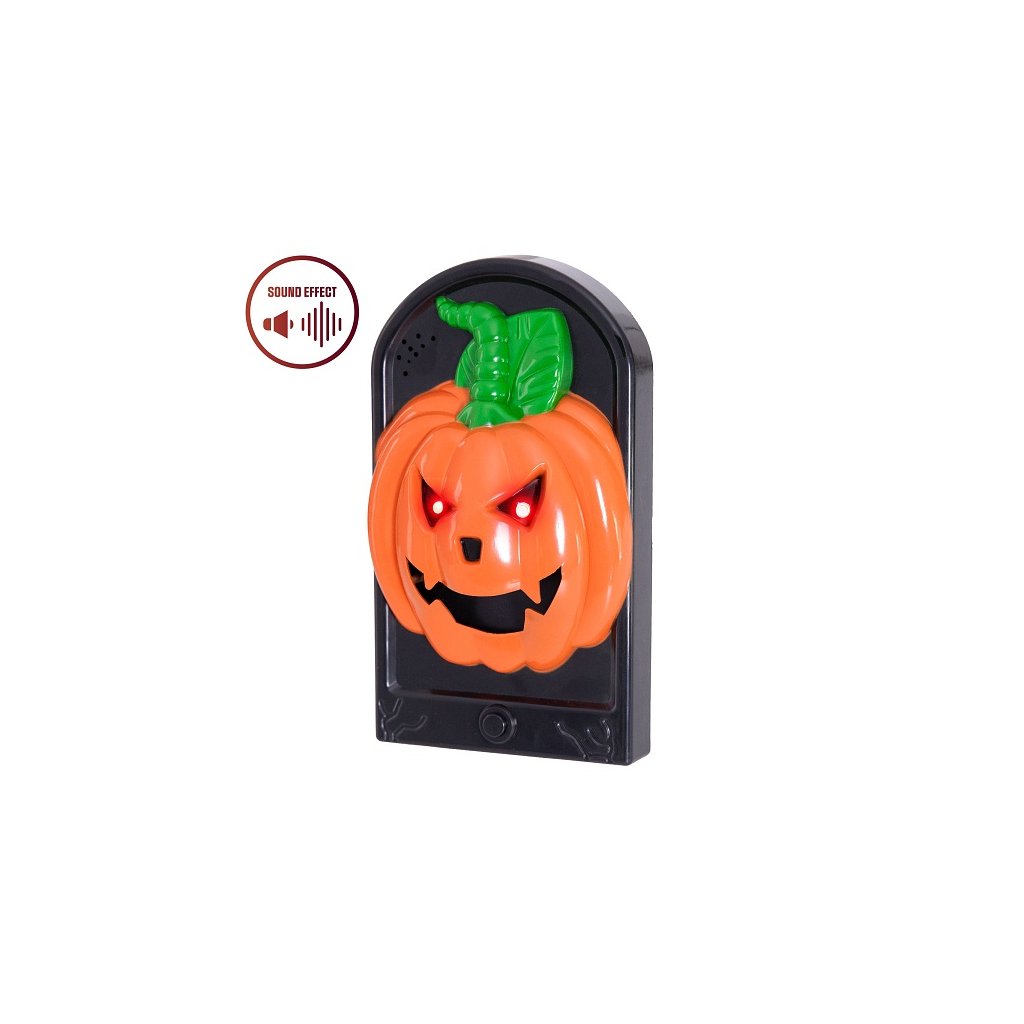 Unikátní zvonek ve tvaru dýně, který nejen vydává děsivé zvuky, ale také svítí a vytváří tak děsivou atmosféru. Výška: 19,5 cm Šířka: 11 cm Napájení: 3 baterie AAA 1,5 V - (baterie nejsou součástí balení)Doplňkové parametry